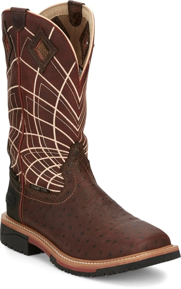 Justin Boots: Men’s SE4835 Brown Ostrich Print Composite Square Toe Derrickman Cowboy Work Boots